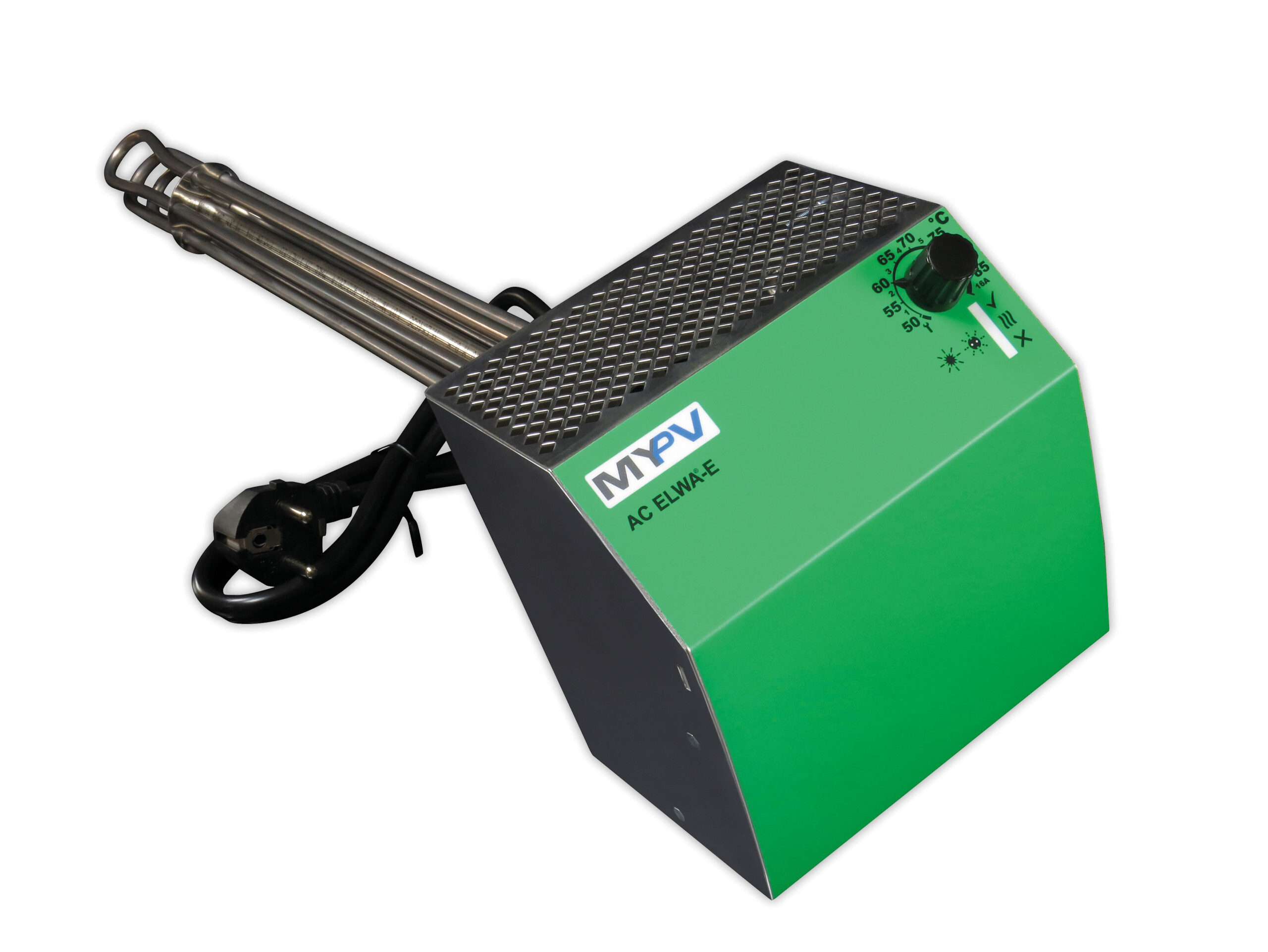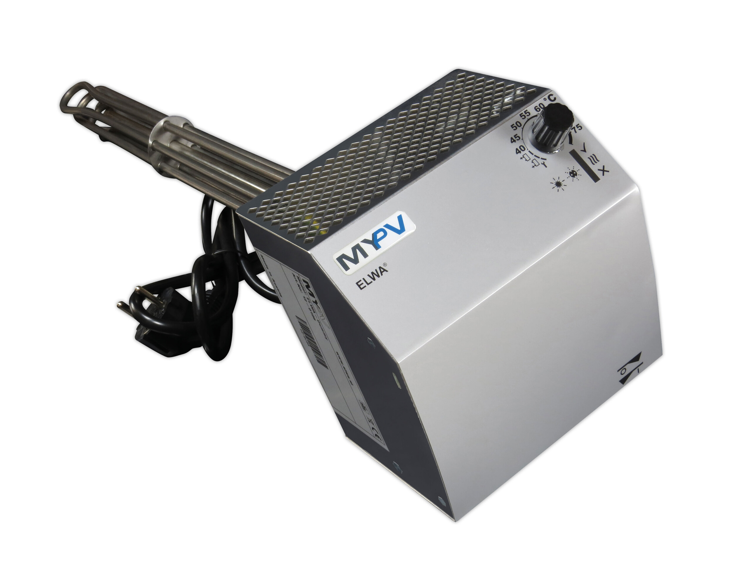 ELWA ist ein 2 kW Photovoltaik-Warmwasserbereitungs-Gerät. Gleichstrom aus Photovoltaik-Modulen wird direkt in den eingebauten Heizstab übertragen und unmittelbar verlustfrei in Wärme umgewandelt. Der eingebaute MPP Tracker sorgt dafür, dass der PV Generator immer im optimalen Arbeitspunkt betrieben wird (ähnlich wie bei einen PV Wechselrichter). Für den Betrieb ist keine Verbindung mit dem Stromnetz erforderlich, da sich das Gerät vom PV Generator versorgt (reiner Inselbetrieb). Mit einem Drehknopf wird die gewünschte Warmwassertemperatur eingestellt, LED Anzeigen informieren über den aktuellen Gerätestatus.